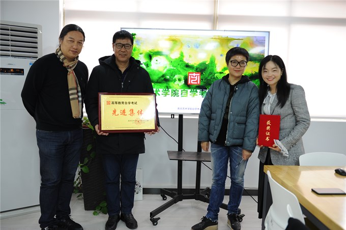 在会上,南京艺术学院成教学院副院长季鹏、成教学院招考办主任马媛媛颁发“高等教育自学考试先进集体”奖牌和“先进个人”证书。