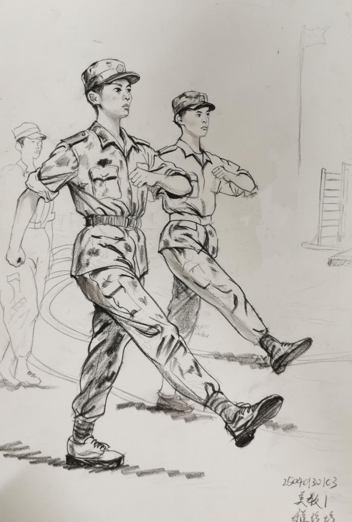 军训期间,学院充分发挥专业特色,组织2025级新生以画笔为媒介,聚焦训练场景,捕捉动人瞬间。同学们在训练之余积极创作,这一笔一划的勾勒,远非简单的形象摹写。它是一次从“形”到“神”的深入体悟,是一次情感的投射与精神的共鸣。在反复观察与描绘中,抽象的“纪律”“团结”“奉献”精神,化为了具体可感的线条与光影,深深烙印在学子心间。对军人作风的敬佩,升华为对忠诚与担当的理解;对集体生活的感受,内化为对团队与荣誉的珍视。艺术创作成为价值内化的催化剂,实现了思政教育从“入眼入耳”到“入脑入心”的升华。