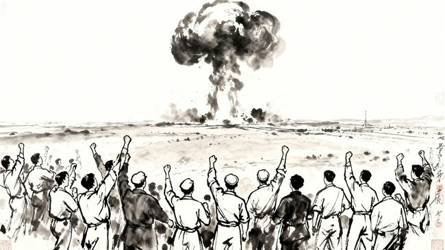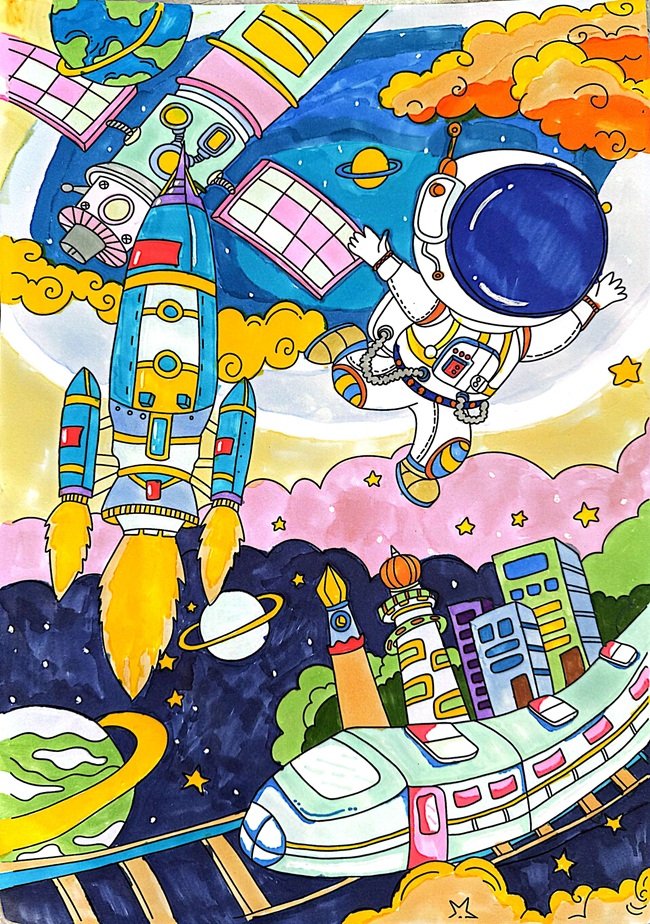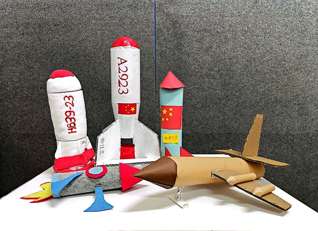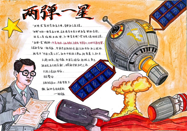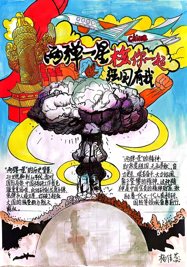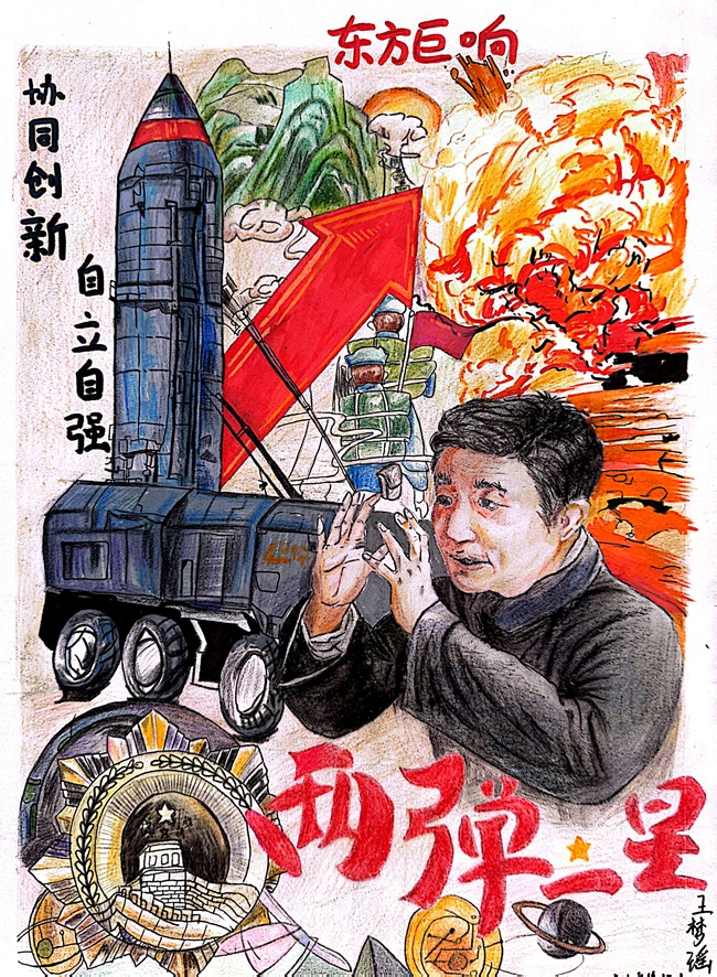 创作过程中,全院学子踊跃参与,以多元艺术形式诠释红色精神。绘画作品中,有学子以写实手法再现戈壁荒漠中科研工作者的坚守身影,用厚重色彩勾勒“红云冲天照九霄”的壮阔场景;海报设计则融合现代视觉语言,将原子符号、卫星轨迹与“强国有我”的青春宣言相结合,传递精神传承的时代气息;手工作品更是创意迭出,同学们利用纸艺、布艺等传统技艺,制作出核试验场景、中国航天模型等作品,让冰冷的历史瞬间变得可触可感。部分作品创新性融入环保材料与数字技术,既展现了美术专业特色,也体现了“自力更生、勇于登攀”的精神特质,实现了传统与现代、艺术与科技的巧妙融合。