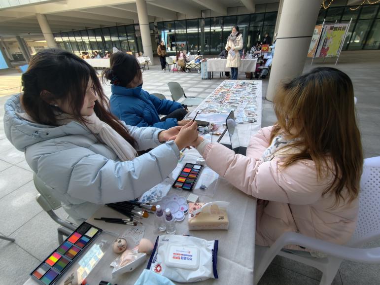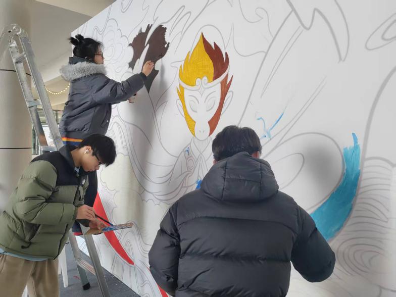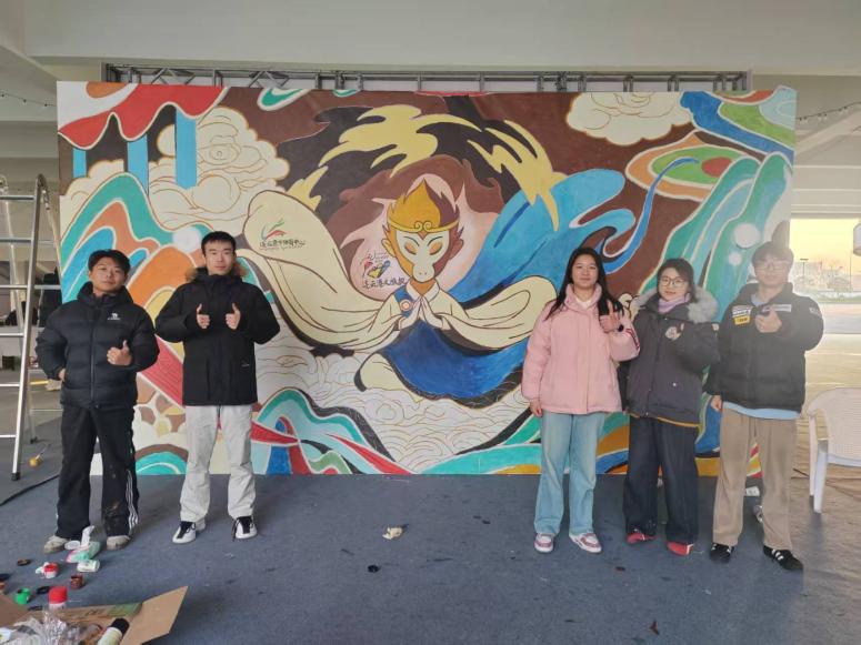 相邻的脸绘艺术摊位则展现了传统文化“体验式消费”的吸引力。学生们以精湛技艺,将西游人物、传统纹样转化为时尚面绘,让文化符号成为可即时消费、社交分享的“艺术快闪”。顾客排起的队伍,正是传统文化通过创新形式赢得当代市场的生动注脚。与此同时,由我院学生主创的大型西游主题墙绘,成为活动现场最具辨识度的视觉地标。这幅融合现代卡通美学与传统线描风格的作品,不仅是公共空间的艺术点缀,更是青春视角对经典叙事的当代重构,为商业街区注入了浓郁的文化叙事氛围。