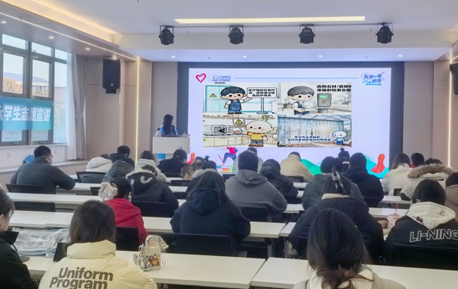 此次活动紧扣“破除认知误区、传播科学理念”核心,将核科普与美术专业特色深度融合,打造了一场“有温度、有深度、有创意”的科普盛宴。宣讲团成员提前备课,将抽象的核物理知识转化为可视化的艺术表达:手绘的核能发电图色彩明快、逻辑清晰,辐射防护科普漫画生动形象、通俗易懂,让原本“高冷”的“硬核”知识变得直观可感。从我国自主研发的“华龙一号”核电技术,到核辐射在肿瘤治疗中的精准应用,再到核能供暖带来的绿色生活,宣讲团成员以案例和数据为基,层层递进,褪去“谈核色变”的固有滤镜,让师生们深刻认识到核技术与日常生活的紧密关联。互动环节中宣讲团精心设计了“核辐射知识大闯关”问答环节,围绕辐射剂量标准、核电安全保障、核技术应用前景等关键知识点抛出问题,现场学生结合宣讲内容精准回应。