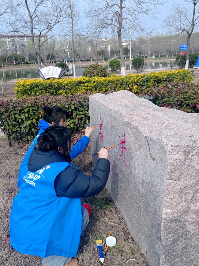 3月8日下午,美术学院党团工作站组织22名党团员青年,开展校园主干道石刻铭文描红志愿服务活动,以青春行动美化校园、传递文明。