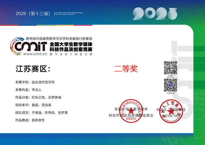 近日,第十三届全国大学生数字媒体科技作品及创意竞赛全国现场总决赛在哈尔滨成功举办。我院学生于美璇、陈秀纹、张梦瑾的作品《守岛人》(指导教师:姜超)凭借其深刻的创意内涵与精湛的技术呈现,荣获全国总决赛三等奖及江苏赛区二等奖,展现了我院学子扎实的专业能力与创新活力。